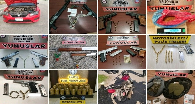Uygulama ve operasyonlar kapsamında yapılan araç, ev ve üst aramalarında, 14 adet ruhsatsız tabanca ve bu tabancalara ait 205 adet fişek, 7 adet ruhsatsız tüfek ve bu tüfeklere ait 146 adet fişek, 2 adet kurusıkı tabanca, 213,85 gram bonzai, 27,83 gram metamfetamin, 6.91 gram esrar, 0,84 gram eroin ile 21 adet uyuşturucu hap ele geçirildi.
